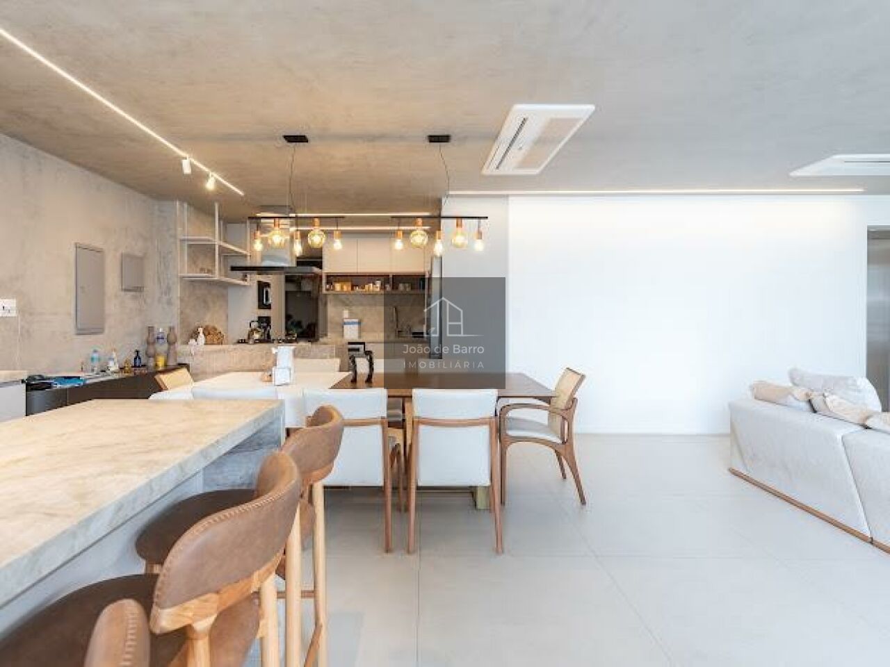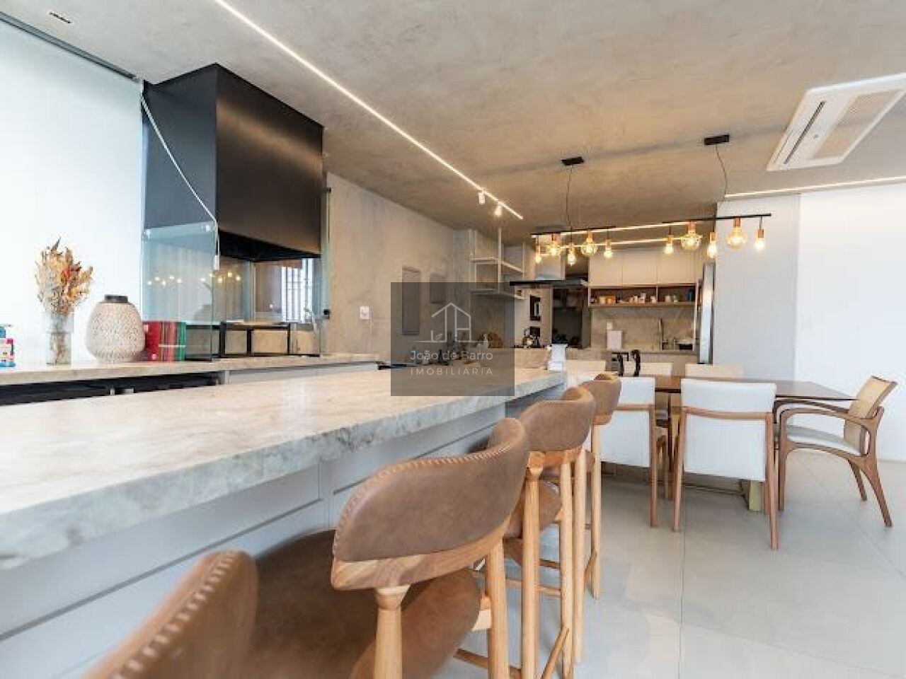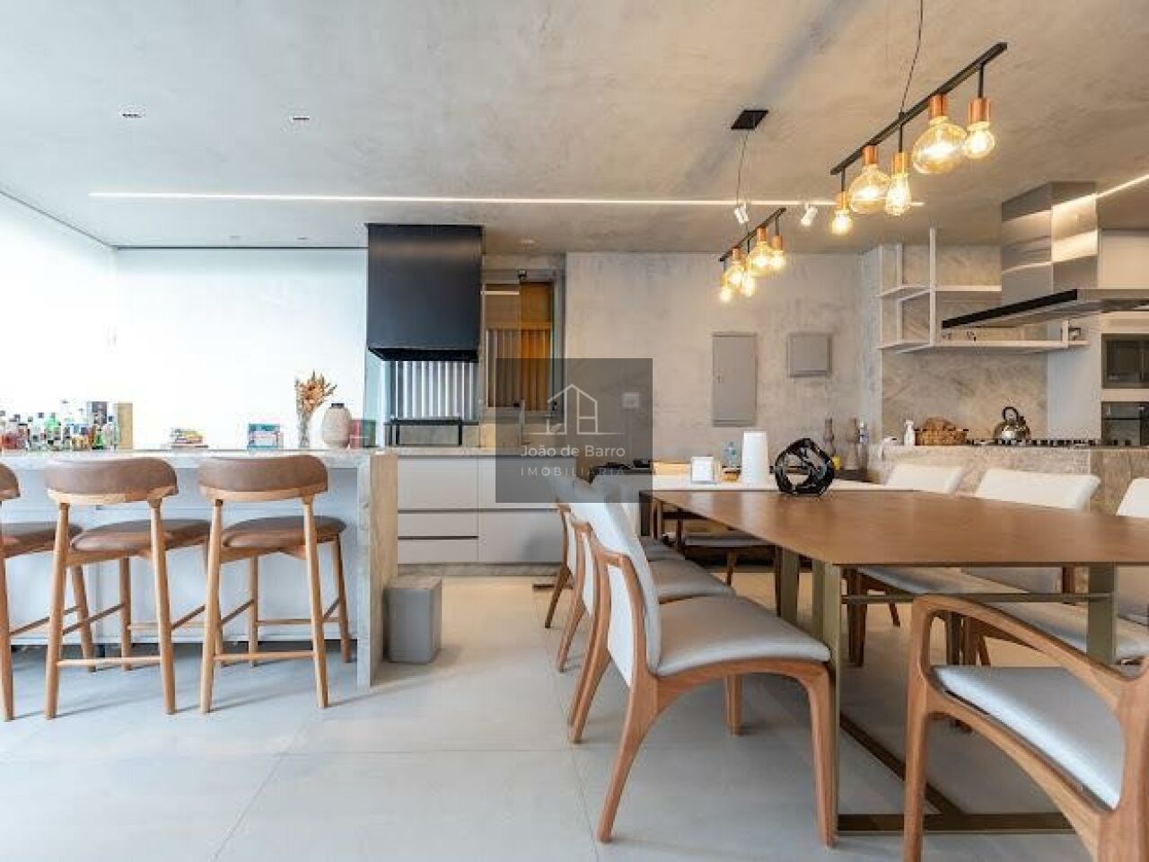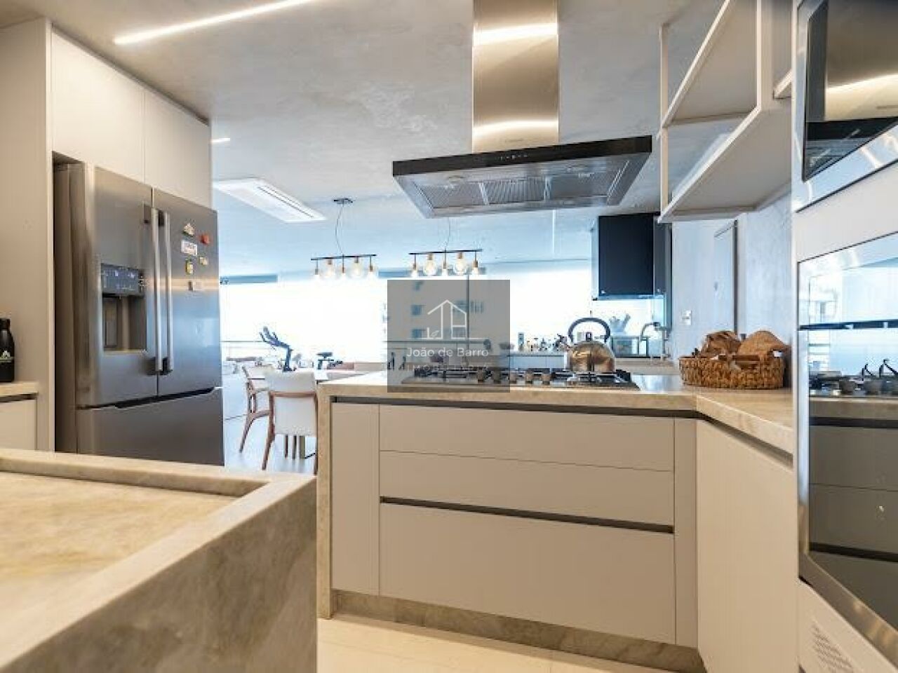 O living é generoso, com integração perfeita entre sala de estar, jantar e espaço gourmet, ideal para receber. A cozinha é moderna, com bancada ampla e acabamentos de alto padrão, conectada à área social, trazendo funcionalidade e elegância ao ambiente.