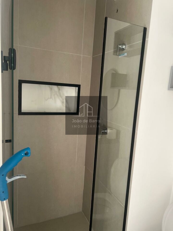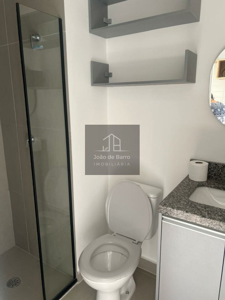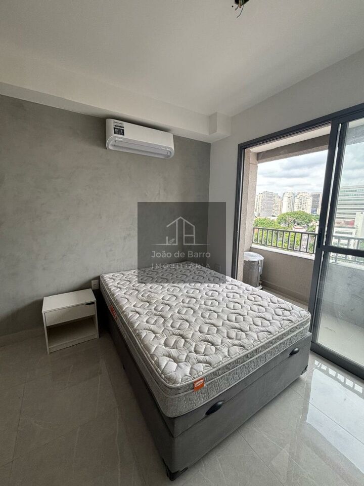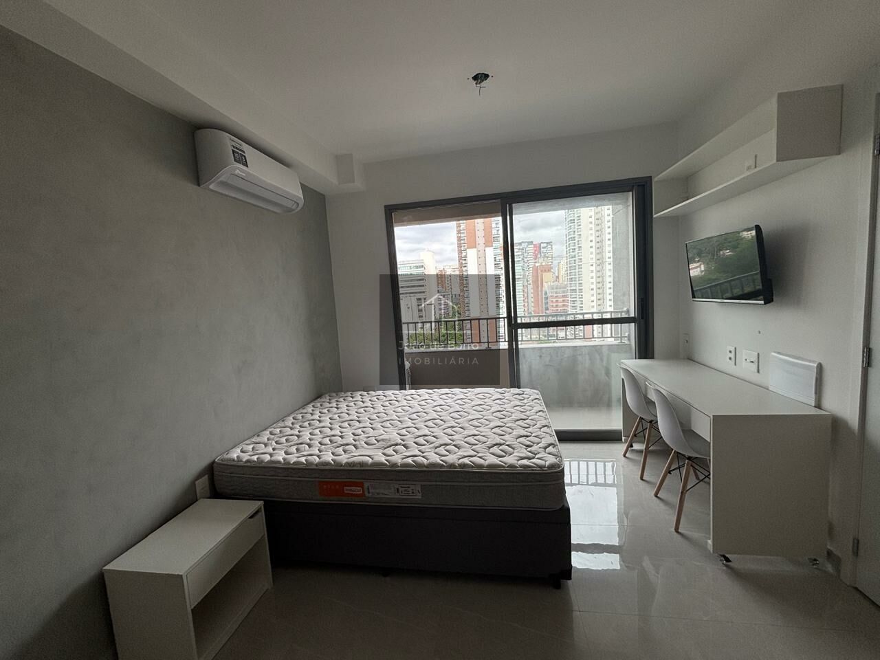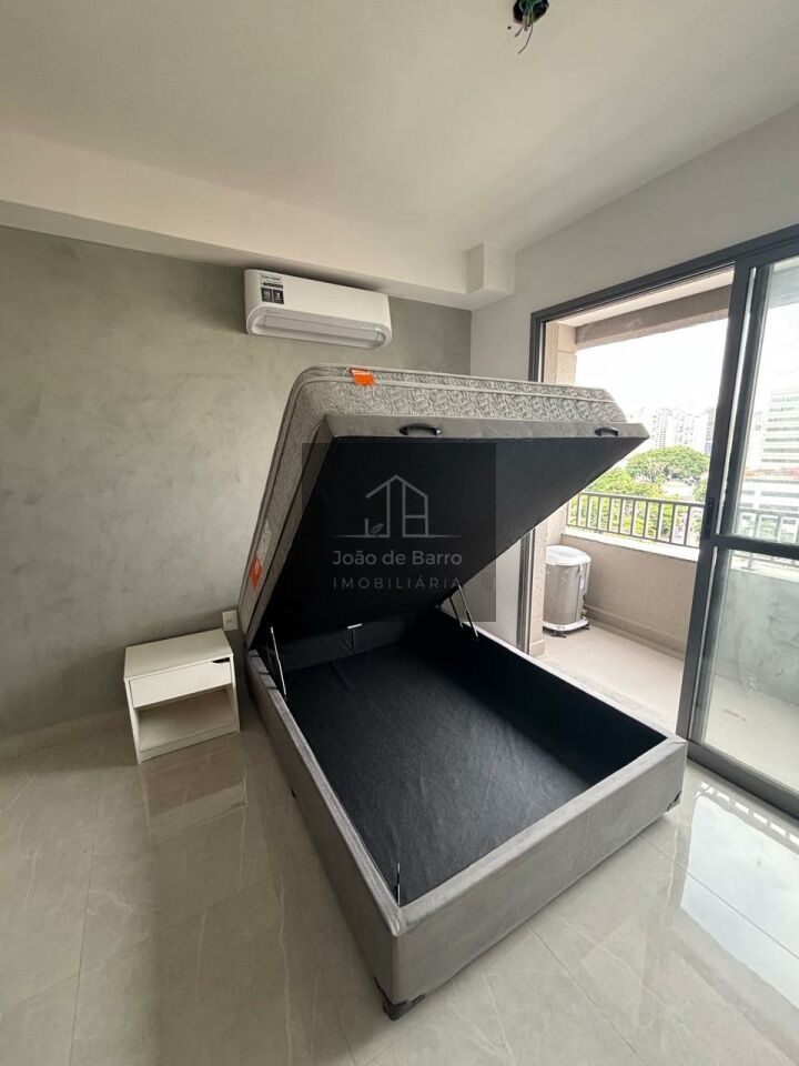 Na área íntima, o studio oferece cama box com baú, colchão de molas e ar-condicionado de 12.000 BTUs. O banheiro possui chuveiro elétrico e box tipo camarão.