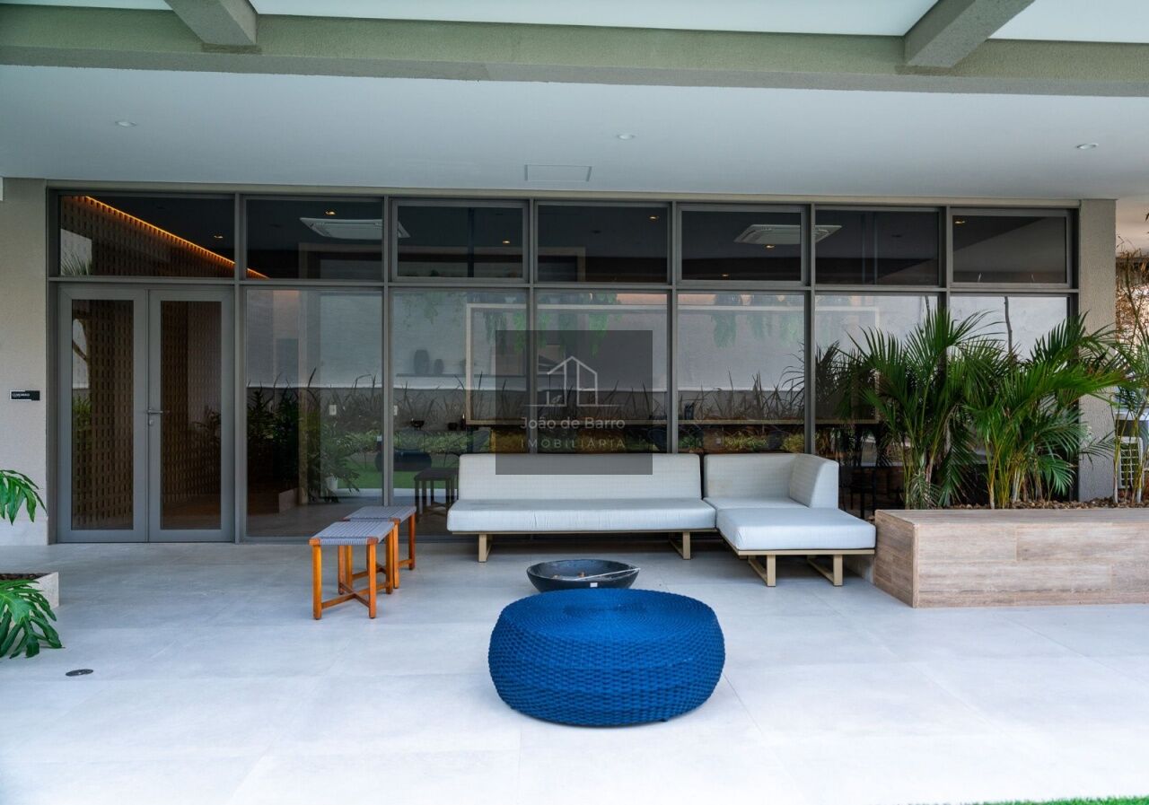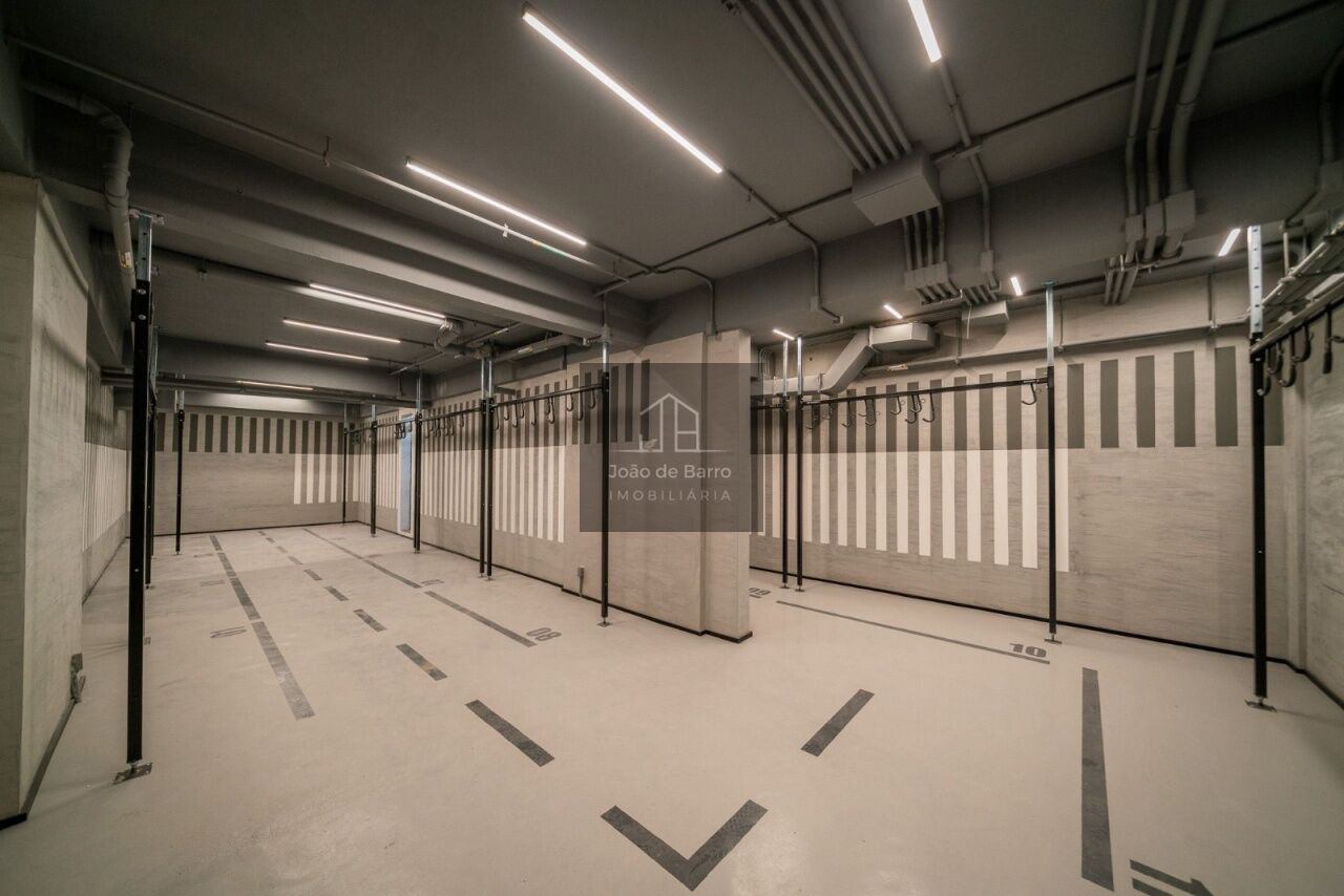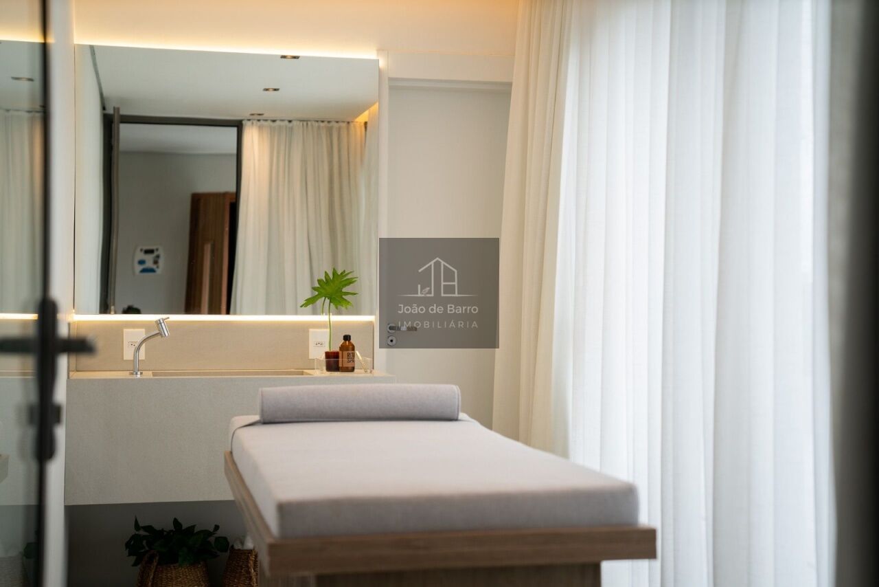 Na área íntima, o studio oferece cama box com baú, colchão de molas e ar-condicionado de 12.000 BTUs. O banheiro possui chuveiro elétrico e box tipo camarão.